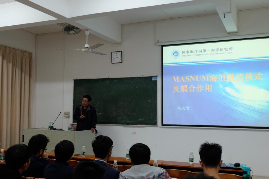 上午,两位专家与户外色情 张书文院长、徐建军教授、凌征研究员在海博楼会议室就“海洋上层混合过程参数化及实验验证”课题进行研讨,对课题进展提出了很多宝贵的意见。下午,侯一筠研究员与杨永增研究员在第二教学楼B1202分别作学术报告,报告厅座无虚席,户外色情 100余名教师、研究生和本科生现场聆听了报告。侯一筠研究员在所做的题为《全球气候变化下的海气耦合系统》的报告中指出了海洋动力研究的重要性与实用性,并由浅到深的介绍了当前背景下的海气耦合系统;杨永增研究员则做了题为《MASNUM海浪数值模式及耦合作用》的报告,系统介绍了MASNUM海浪数值模式的定位、发展目标与应用。