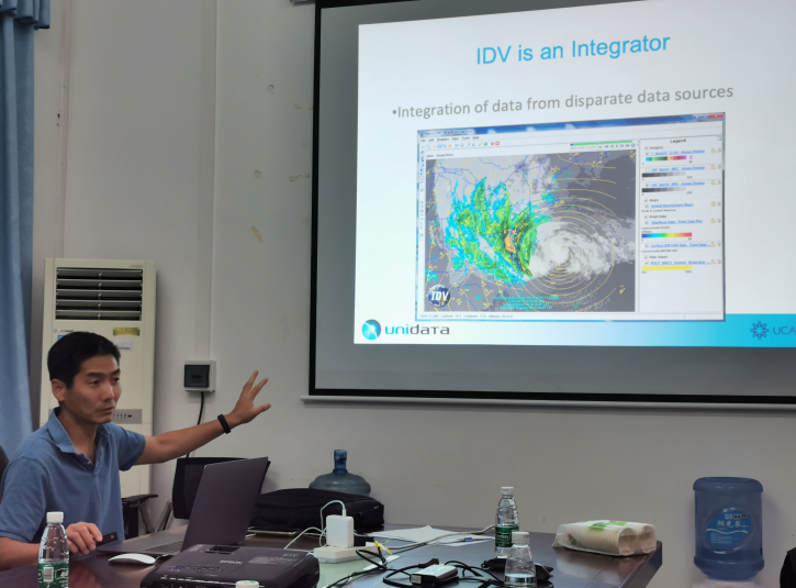 报告会上,何元高级研究员首先介绍了集成数据查看器(Integrated Data Viewer,IDV)系统的基础和特色,该系统是基于VisAD库建立的集交互式、可视化和数据分析于一体的气象平台系统;同时,深入浅出地讲解了开发IDV系统所采用的多源数据处理、时间匹配、空间驱动等关键技术方法;接下来,他通过演示IDV系统操作,展示了双台风“剑鱼”和“玲玲”的三维动态图像,图像完美呈现了双台风的空间结构和发展过程,令在场师生赞叹不已。会后,何元研究员同与会师生进行了学术交流与讨论,徐建军教授认为IDV系统的推广应用能够助力和推进教学及科研工作,希望今后进一步加强双方的合作交流。