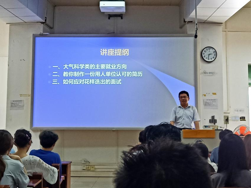 张夏琨老师指出本次报告将从三个方面来介绍,分别是大气科学类的主要就业方向,怎样制作一份用人单位认可的简历以及如何应对各种面试。