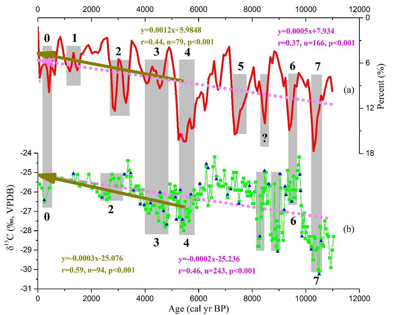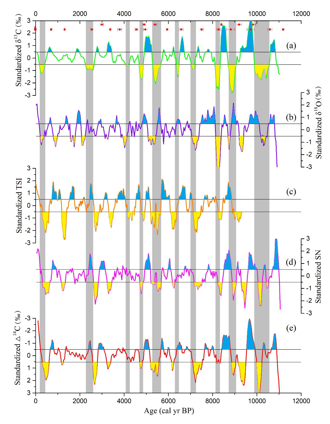 户外色情海洋地质团队成员黄超经过反复的条件实验,建立了适合泥炭岩芯样品的α-纤维素提取方法,基于在北疆阿勒泰山获取的长达7.5m的泥炭岩芯,开展α-纤维素碳同位素研究,并结合在泥炭地海拔梯度上开展为期2年的现代观测结果(图1),论证了阿勒泰泥炭α-纤维素碳同位素是一个比较可靠的古温度指标,重建了该研究区域过去11500年以来夏季温度的演化历史(Rao and Huang, 2019)。并且发现该区域夏季温度还呈现千年尺度和百年尺度的波动变化特征。千年尺度上,阿勒泰泥炭α-纤维素碳同位素清晰的记录了数次明显的气候突变事件,与北大西洋浮冰碎屑事件具有较好的对应关系(图2),说明北大西洋的温度变化可通过西风环流对中亚干旱区的温度产生一定的影响。百年尺度上,将阿勒泰泥炭α-纤维素碳同位素记录、太阳活动指标(TSI、SN以及△14C)同时进行标准化处理,剔除长期变化趋势,获得百年尺度的变化信息,并进行对比分析。结果发现,阿勒泰地区的夏季温度的异常变化刚好与减弱的太阳活动吻合(图3),说明百年尺度上阿勒泰地区的夏季温度变化主要受到太阳活动的影响。为了进一步确定阿勒泰地区夏季温度与太阳活动之间的关系,我们对阿勒泰泥炭记录与太阳活动指标SN和△14C分别进行时间序列的滤波分析和交叉谱分析,结果发现存在数个显著的百年太阳活动周期。这些对比分析进一步表明,阿勒泰地区百年尺度的温度异常变化受控于太阳活动的影响。