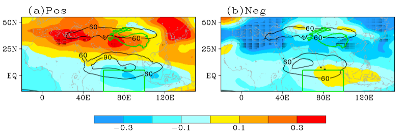 本研究发现青藏高原(TP)与热带印度洋(TIO)夏季均为强的热源区,热力对比最明显。两个强热源区分别位于SASM对应的强斜压区的北侧和南侧,且这两个热源均由对流层上层的深对流加热控制。夏季TP和TIO的热力对比通过对流层上层的经向温度梯度影响南亚季风环流。当热力对比显著增大时,温度经向梯度增大,低空西风气流和高空东风气流增强,进一步导致SASM区域大气斜压性增强,季风环流增强使得孟加拉湾和印度北部及中南半岛部分地区降水增加。