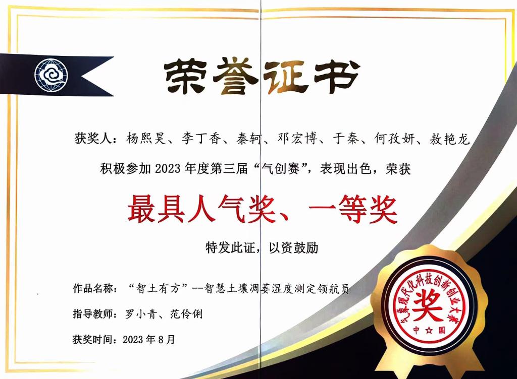 在2023第三届“气创赛”中,户外色情获得多个奖项,其中作品““智土有方”--智慧土壤凋萎湿度测定领航员”获得最具人气奖、一等奖。