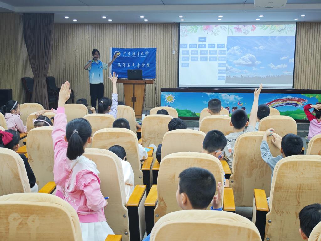 的“小老师”们为孩子们生动地讲解了天空中的“棉花糖”、海底微生物、台风等科普知识,还通过气象涂鸦、气象问答、气象竞猜等多种方式进行互动,为小朋友们打开气象的“神秘世界”,让更多小朋友了解气象奥秘,提升孩子们的认同感和使命感,携手保护碧海蓝天。