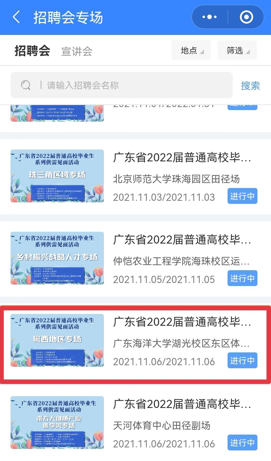 进入“广东大学生就业创业”小程序→点击毕业生求职→点击广东省2022届普通高校毕业生系列供需见面活动