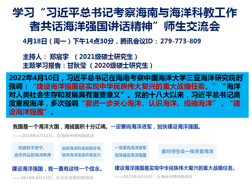 2020级硕士研究生甘秋莹同学首先带领大家一起学习了习近平总书记在海南考察期间与海洋科教工作者共话海洋强国讲话精神,以及党的十八大以来总书记关于“建设海洋强国”的相关重要论述。2022年4月10日,习近平总书记在海南省三亚市考察中国海洋大学三亚海洋研究院,了解发展海洋科技等方面的情况,总书记在考察时强调:“建设海洋强国是实现中华民族伟大复兴的重大战略任务。”党的十八大以来,习近平总书记高度重视海洋,多次强调“海洋对人类社会生存和发展具有重要意义”,“要进一步关心海洋、认识海洋、经略海洋”,“一定要向海洋进军,加快建设海洋强国”。习近平总书记到中国海洋大学三亚海洋研究院视察,充分体现了总书记对海洋强国建设的高度重视。
