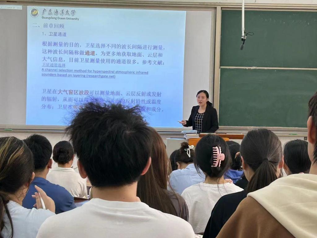 第二场观摩课由获得学校第11届教学质量优秀奖获得者——常舒捷老师主讲,内容为专业基础课——《卫星气象学》,授课内容为“气象卫星图像的分析基础”。常老师通过开展课程回顾方法回顾了卫星通道、吸收带和大气窗,引导学生对可见光卫星云图、红外云图、水汽图的相关知识,同时,紧密联系生活实践,利用例证法进而说明三种卫星图像的区别与联系。通过讲解发生于今年的有气象记录以来全球最长寿的热带气旋“弗雷迪”相关的卫星云图使本来非常难于记忆与枯燥的知识点变得浅显易懂;此外,巧妙设置问题,引起学生思考,激发学习兴趣。