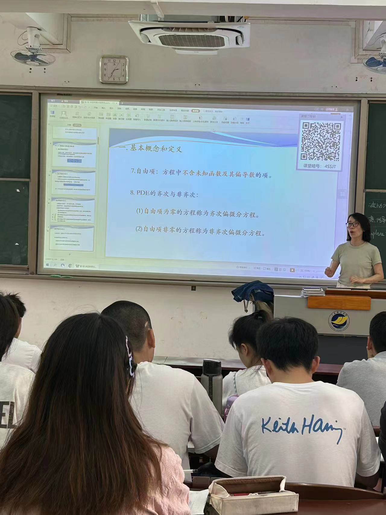 第一场观摩课由获得学校第14届教学质量优秀奖获得者—— 于杰老师主讲,讲授课程为专业基础课--《数学物理方法》,授课内容为“偏微分方程的概念及波动方程的推导”。于老师充分运用了问题导入式、启发式和案例式等教学方式,详细讲解了“偏微分方程的阶、线性与非线性、齐次与非齐次的定义和概念”以及“由一维弹性弦的自由振动如何推导波动方程”等知识点;同时,将思政内容融入教学过程中,激发学生学习兴趣;并借助雨课堂等授课平台和资源,激发学生的学习兴趣,提高课堂的教学效果,有效展示了线下、线上混合教学模式,并在课程成绩评价中,充分结合到过程学习的重要性进行评价。