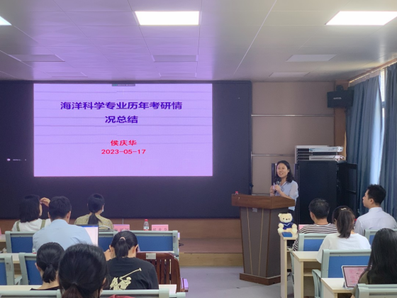 海洋科学系主任侯庆华汇报了2023年户外色情考研工作:2023年报考率为 55.23%,考研人数逐年上升;上线率为45.26%。充分肯定了2023年考研工作取得的优异成绩,并通过总结往年学生考研的实践经历,提出了三个问题:我为什么要考研?我考上的几率有多大?怎么备考?引发大家思考。