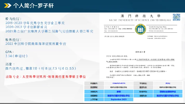 李汶霖同学先是向我们介绍香港的大学排名,以及海洋科学可以申请什么专业的研究生,为有意留学的同学提供了目标,后详细说明材料的准备,顺水推舟谈及录取后工作,留学时间规划扫清未知的前方。