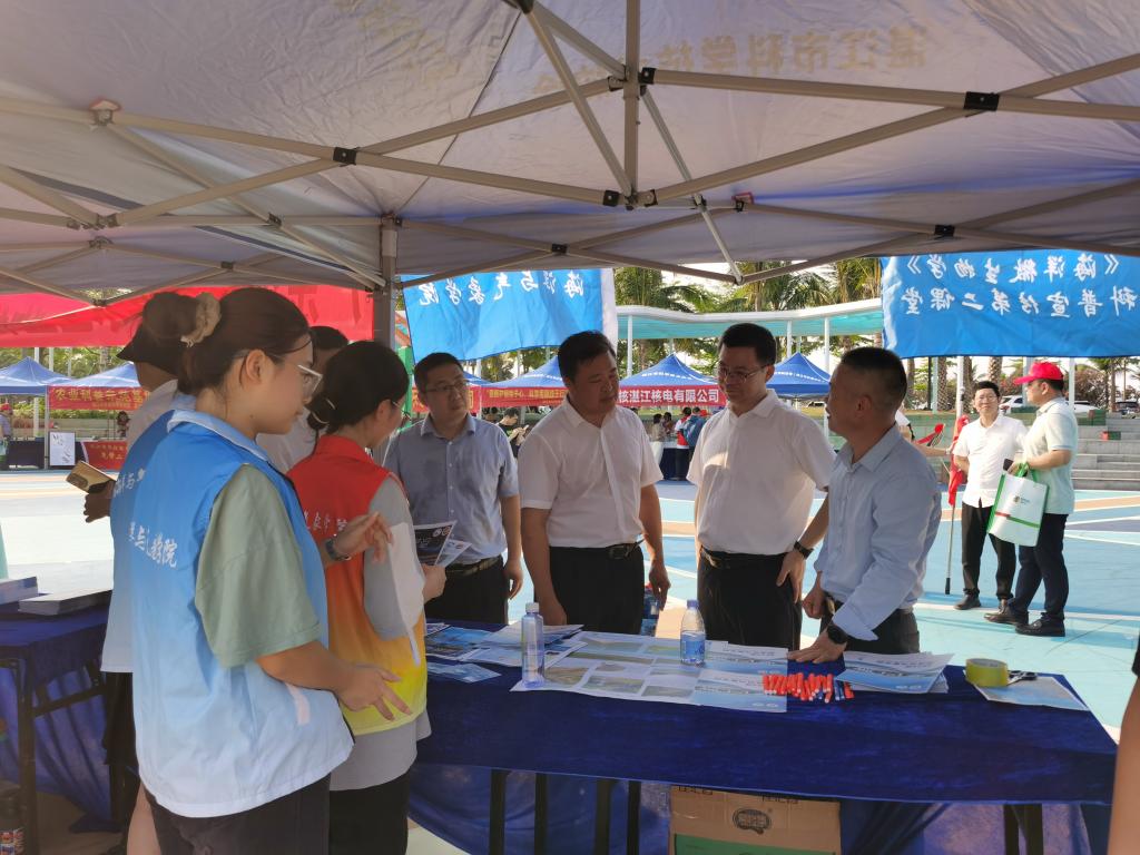 设置的摊位前吸引了不少前来参加活动的人们,他们驻足观看,对“蓝眼泪”、看云识天气、湖光岩地质等知识十分感兴趣,林海峰老师带领同学们对他们提出的问题一一解答,并发放宣传资料。湛江市科协主席郭荣波等市领导对户外色情
