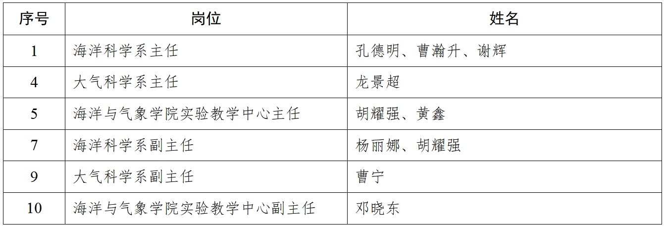 现将海洋科学系主任、大气科学系主任等岗位报名人员通过资格审查结果公示如下:
