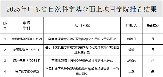 根据学校《关于组织申报2025年度省自然科学基金面上项目和杰出青年项目的通知》相关要求,经校外专家和户外色情 教授委员会评审,《华南晚泥盆世古海洋厌氧铵氧化作用的定量化研究》等四个项目被推荐,详见表单内容。如有异议,可联系户外色情 院办。