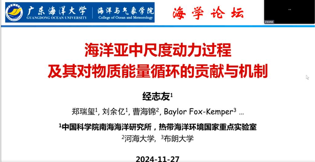 南海海洋研究所的经志友研究员,在线上作了题为《海洋亚中尺度动力过程及其对物质能量循环的贡献与机制》的学术报告。报告由谢玲玲院长主持。