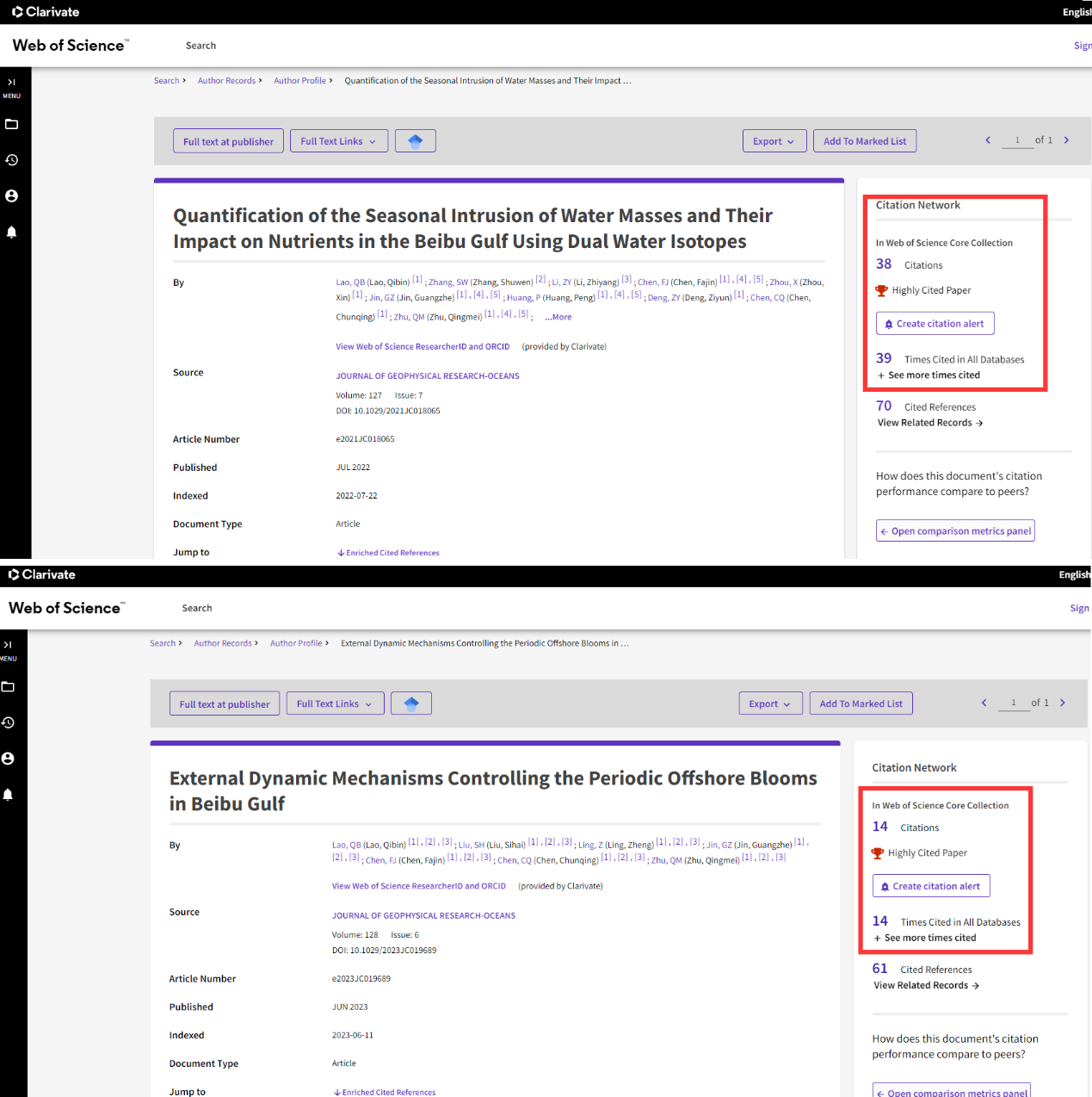 近日,据科睿唯安基本科学指标数据库(Essential Science Indicators,简称ESI)最新数据显示,我校海洋科学学科2篇论文“Quantification of the seasonal intrusion of water masses and their impact on nutrients in the Beibu Gulf using dual water isotopes”(Lao et al., 2022, Journal of Geophysical Research: Oceans)和“External dynamic mechanisms controlling the periodic offshore blooms in Beibu Gulf”(Lao et al., 2023, Journal of Geophysical Research: Oceans)入选ESI全球前1%高被引论文(图1),实现我校海洋科学领域研究的重要突破。这两篇论文的第一作者均为博士研究生劳齐斌,陈法锦教授为唯一通讯作者。