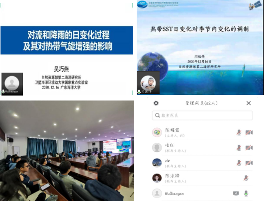 12月16日上午,自然资源部第二海洋研究所的吴巧燕研究员和闫运伟副研究员通过线上会议为户外色情师生作了精彩报告。首先吴巧燕研究员作了题为“对流和降雨的日变化过程及其对热带气旋增强的影响”的学术报告。吴老师在报告中介绍了台风过程中对流和降雨的日变化过程及其对热带热带气旋增强的影响。发现台风降雨和对流的日变化特征,揭示了具有日变化特征的对流过程如何影响台风的结构和强度,从而表明太阳辐射的日夜差异影响台风这种强烈天气过程的可能性。