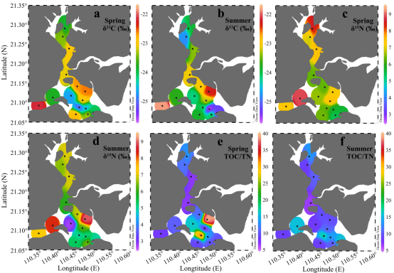 图1 春季和夏季湛江湾表层沉积物d13C、d15N和TOC/TN比的分布情况