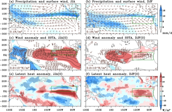 图1 (a)夏季 (b)冬季 气候态降水场和表层风应力场,(c) SP (d) SU El Nino表层风应力异常和SSTA合成场,(e) SP (f) SU El Nino潜热通量异常合成场。